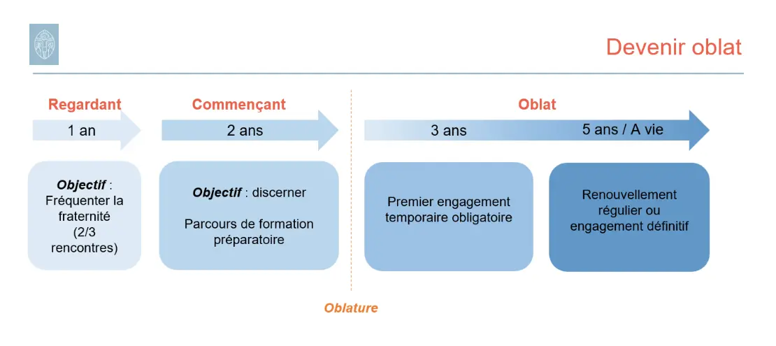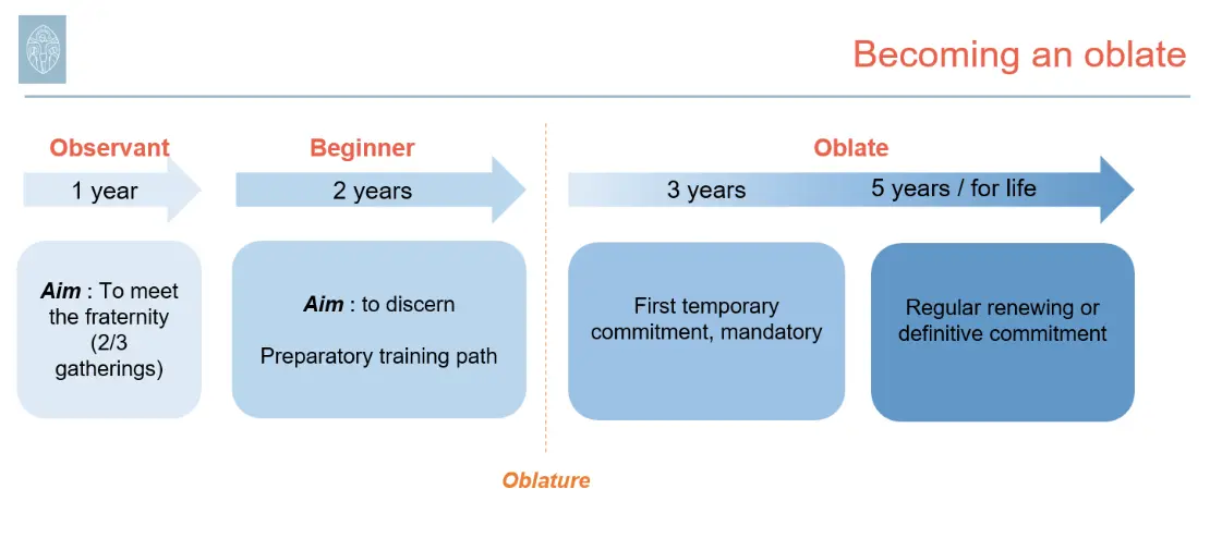 Devenir oblat est un cheminement progressif de discernement, de formation et d'engagement. Celui qui se sent appelé commence par rencontrer une fraternité locale et participer à plusieurs rencontres pour découvrir son rythme de prière, de partage et de formation.